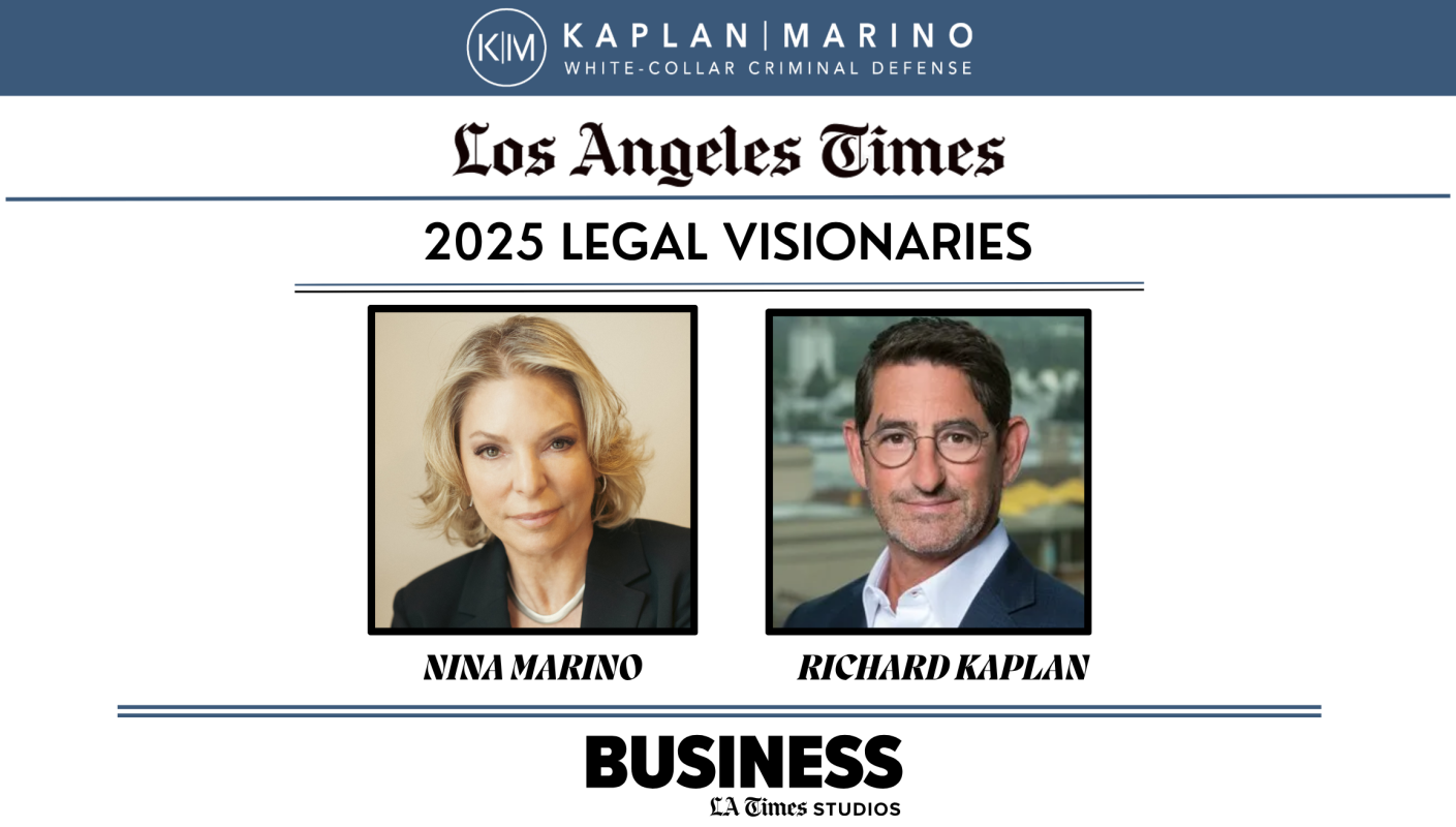 For the fifth year in a row, partners Nina Marino and Richard Kaplan were recognized as Legal Visionaries by the Los Angeles Times. The Southern California Legal Visionaries are recognized by the LA Times as “some of the best and brightest.. their dogged dedication to both clients and craft…make them worthy of this recognition."